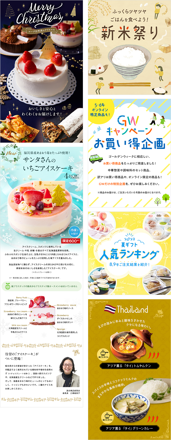 コープ自然派事業連合の会員向けサービス内の特集記事のバナーの制作を月1回程のペースで制作しています。顧客のデザインテイストの要望が変更した頃から担当することになりましたが、顧客から毎度高い評価をいただいています。バナー以外の作業としては、毎年クリスマス特集の商品画像50点程の制作や、サイトのフロントデザインの作成、コーディング作業の見積作成、顧客対応などです。